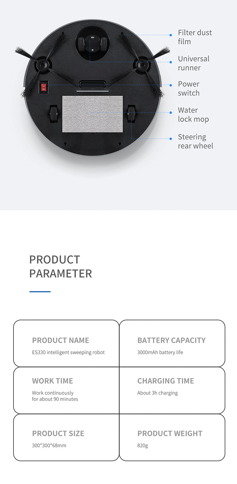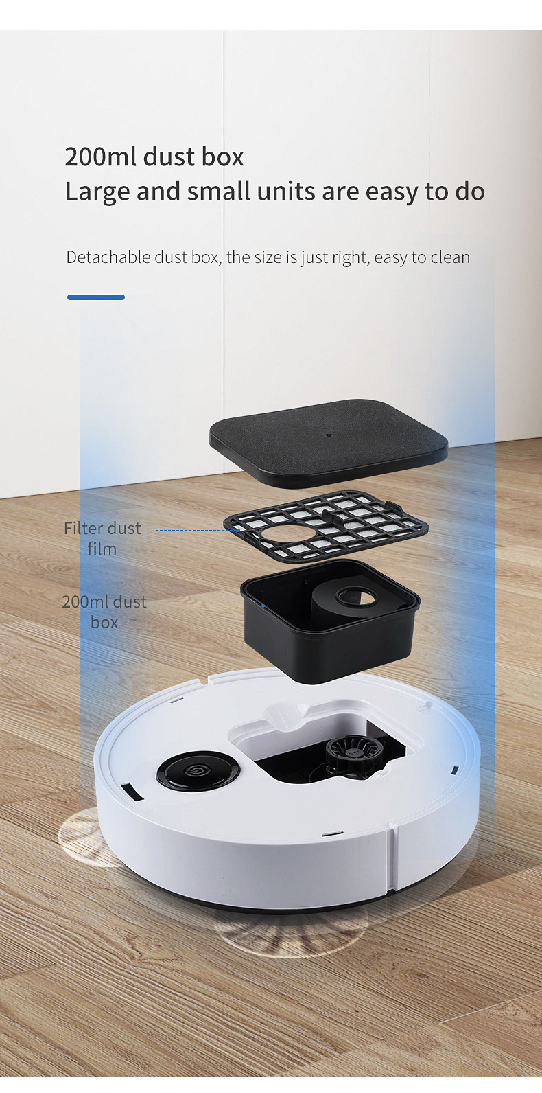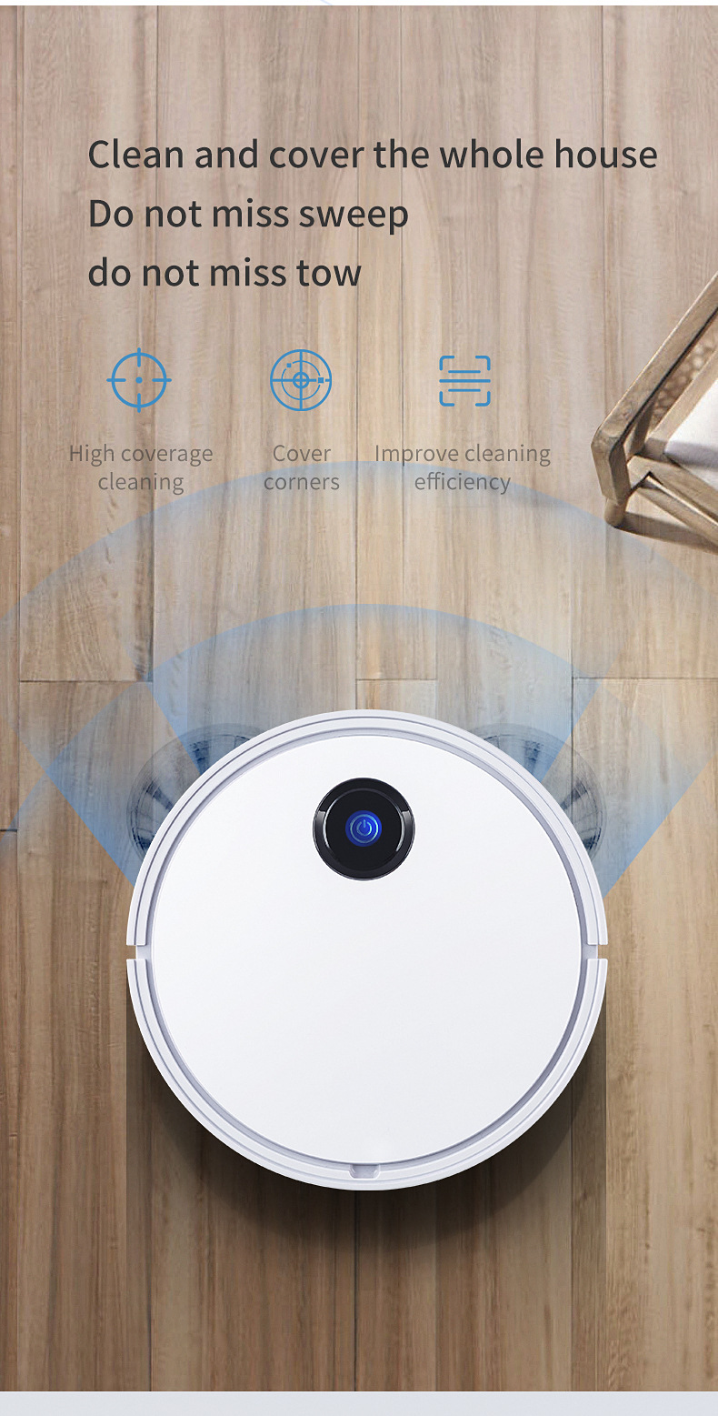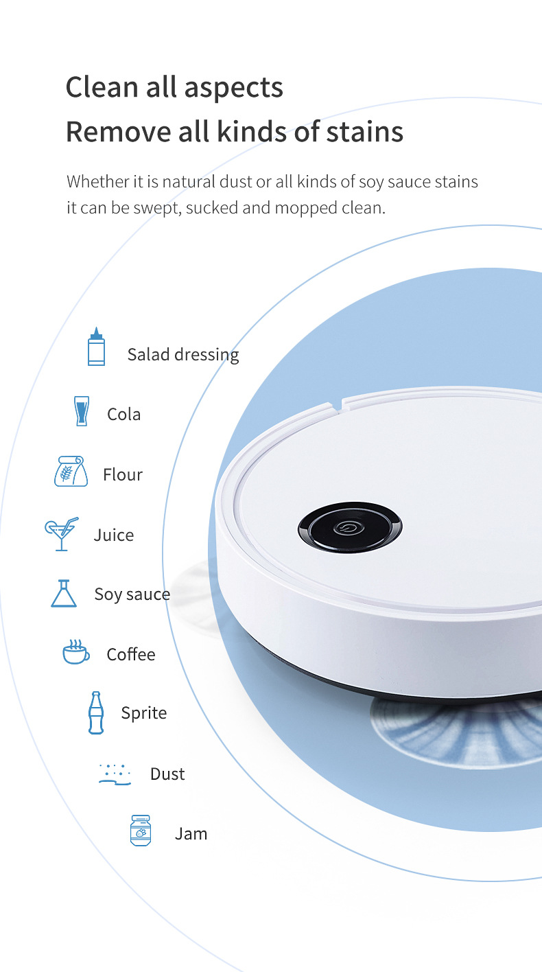 This is an intelligent sweeping robot with an integrated design of sweeping, suction, and mopping. When encountering obstacles, it will turn and rely on the bottom to absorb dirty cigarette butts, melon seed shells, dust, dog hair, and hair on the floor